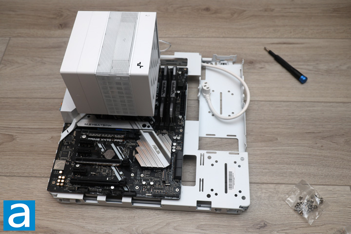 In my case, I attached my ASUS Prime X470-Pro with an AMD Ryzen 7 3700X and a set of Patriot Viper RGB DDR4-3600 2x16GB sticks onboard. On top of the processor, I have a DeepCool ASSASSIN IV WH, which has a height of 164mm. With the Cooler Master QUBE 500 Flatpack fully assembled, we have a maximum clearance of 164mm to 172mm for the CPU cooler, depending on some other components, as you will see later.