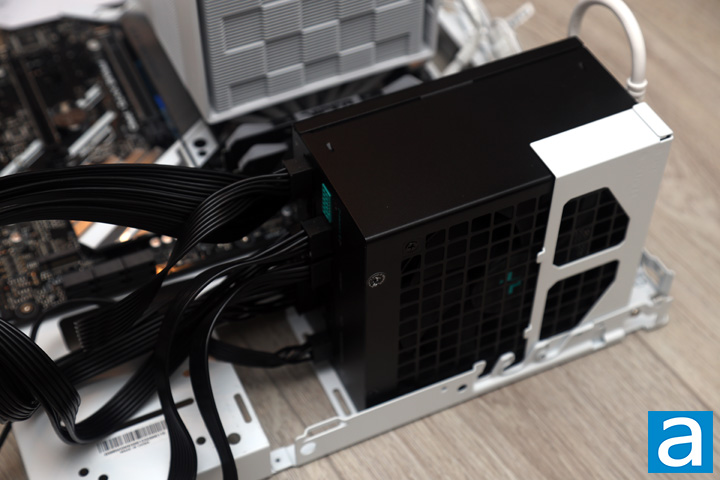 For my own build, I first plugged in all of the necessary cables before mounting the power supply here. The unit here in question is the DeepCool PX1000G 1000W, which is 16cm in length. Cooler Master specifies two maximum lengths for the power supply. The first is 173mm, which is the length before the first expansion slot. This is important, since there could be a graphics card that would go into the power supply area. The next number is 216mm, which is the maximum space provided in the indentation at the front. Of course, you can also reroute the internal extension cable and mount the power supply at the bottom of the case. This is only possible if you are using an mATX motherboard or smaller, so do bear this in mind if you need to take this route. This change will provide a total of 332mm of space at the bottom for the power supply and cable management. These limitations are understandable, given the fact we are dealing with a smaller enclosure overall. Otherwise, once the power supply was mounted, I routed some of the cables where they needed to go, while also connecting the ones I could on the motherboard. It is important to do this as soon as possible, especially as you will have less space to work with later on in the build.