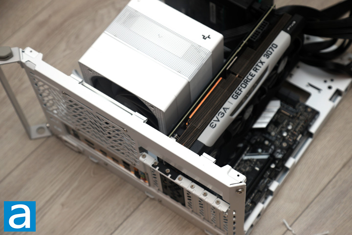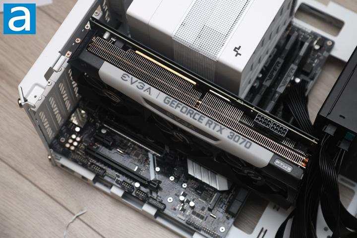 As for my graphics card, I mounted an EVGA GeForce RTX 3070 FTW3 ULTRA GAMING here. Measuring 300mm long, the Cooler Master QUBE 500 Flatpack has a maximum supported length of 365mm. Of course, this also depends on how much space you need with your power supply. For my own case, you can see the cables are somewhat close to the graphics card, but thankfully there is more than enough room here. Otherwise, this accounts for all of the main components installed here, so the next steps are to install the other panels and storage at the back.