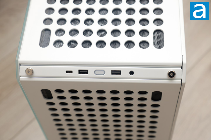 Moving to the front facing I/O, all of them are found on the top slanted edge. A single row of inputs and buttons can be found here. From left to right, we have a USB 3.2 Gen 2x2 Type-C port, a USB 3.1 Type-A port, a power button, a second USB 3.1 Type-A port, and a combination 3.5mm audio and microphone jack. The power button in the middle has a nice click and illuminates in white when the computer is turned on. Unfortunately, we do not have any sort of storage activity light. Otherwise, I would have liked to see a splitter for the audio jack in case users have an older style of separated 3.5mm audio inputs.