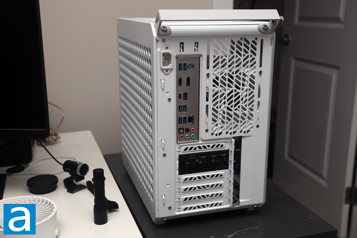 Turning to the back, we have a pretty standard layout here with some slight changes. First of all, you will notice we do not have a power supply opening. As we already saw with how the power supply is mounted internally, the only thing exposed at the back is a connector at the top left corner. Next, we have an opening for the motherboard I/O. Beside this are rails for a 120mm exhaust fan, which is where the Cooler Master SickleFlow 120mm fan is mounted. Finally, at the bottom are the bridgeless expansion slots. As we have already talked about, these expansion slots can be removed and turned vertically to support mounting your GPU in this orientation.