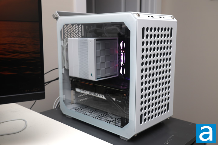 With everything finally assembled and my computer installed into the Cooler Master QUBE 500 Flatpack, I can do a bit of an external physical look. The all-white Cooler Master QUBE 500 Flatpack is consistent in finish and color. The white really pops out and I appreciate the commitment to this, as seen in the cables and the rim around the tempered glass. As you have already seen, the QUBE 500 is made up of many panels that are perforated. This includes a large grid of circular holes. The holes are functional too, as Cooler Master has 3D printing patterns available for users to create their own accessories, such as hooks for hanging peripherals, cup holders, action camera mounts, and more. As well, all of the grid panels have lots of mesh filters underneath to prevent dust from entering on these sides. All in all, this combination of potential functionality and mesh panels is great to see.