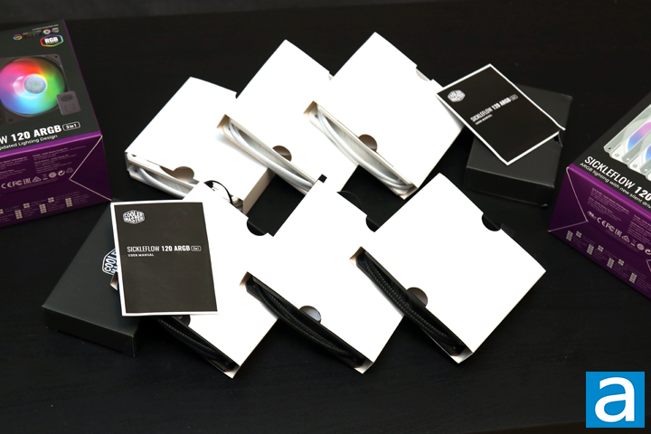 Out of the retail containers of the Cooler Master SickleFlow 120 ARGB 3IN1, we have each fan packaged in their own white cardboard sleeve. An additional black box containing extra cables and the included lighting controller. I do appreciate this extra packaging to ensure the cables do not catch in the fan impellers while also reducing the amount of plastic in each box. Otherwise, some documentation is included to highlight disposal and other information. Just for your knowledge, the Cooler Master SickleFlow 120 ARGB 3IN1 comes with two years of warranty from the manufacturer.