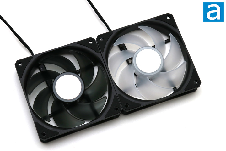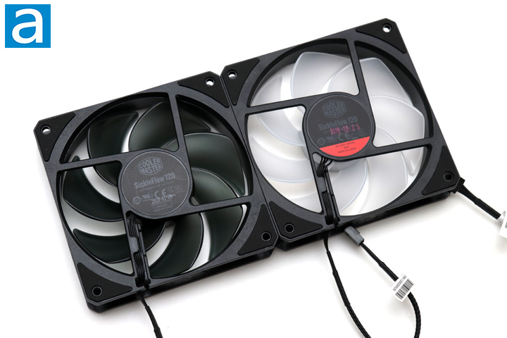 Fans are often seen as an add-on to your build and deemed more to be a functional item rather than for design or appearance. As such, the Cooler Master SickleFlow 120 fans are not too showy in their aesthetics. Each utilize a black plastic frame, while the impeller is of a different color plastic depending on the model. The standard SickleFlow 120 is a very dark grey that is still translucent if you look closely. The models with LEDs inside are made of a translucent white plastic. Cooler Master does keep their logo in the middle of the fan with a large silver sticker and the Cooler Master hexagonal logo outline. On the edges, you can see there are black rubber pads around each mounting hole. These act as dampeners for the fan, reducing vibration and the resultant noise that the fan may make when mounted onto something stiffer.