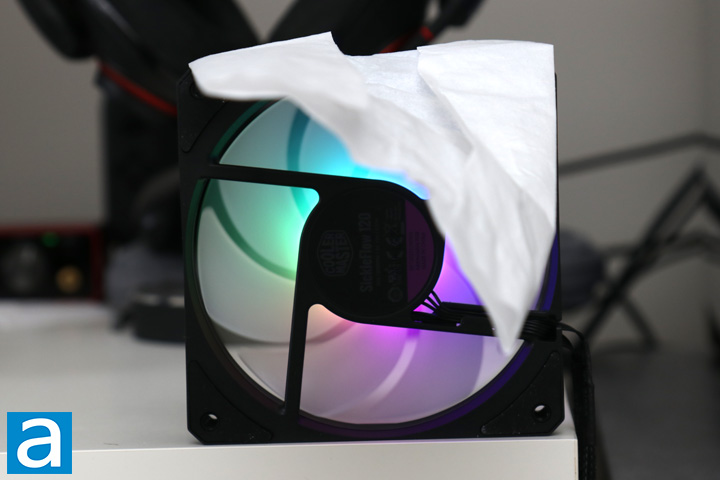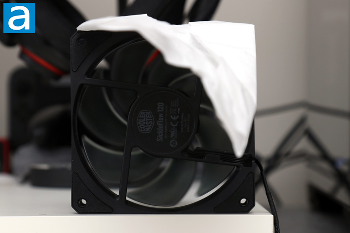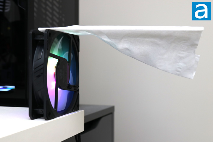 To test the performance of the fans, the APH Networks proprietary testing method invented right here at APH Networks was used. While it is by no means the most objective of tests, this allows you to test your fans at a minimum cost using a piece of tissue paper and tape. As shown by the above photos, a piece of tissue paper was attached on top of a fan. The tissue paper should be able to naturally fall down and cover the air outlet side -- the side where the motor rack is located -- of the fan. We have placed the tested fans near the edge of the desk to prevent air from the bottom surface from bouncing back, thereby masking the actual performance characteristics of it. Once the fans were powered on, the airflow, airflow consistency, and the amount of static pressure can be evaluated by observing the behavior of the tissue paper. Even though we received and tested four different variants of the SickleFlow 120 fans, I have only taken photos of two of them.