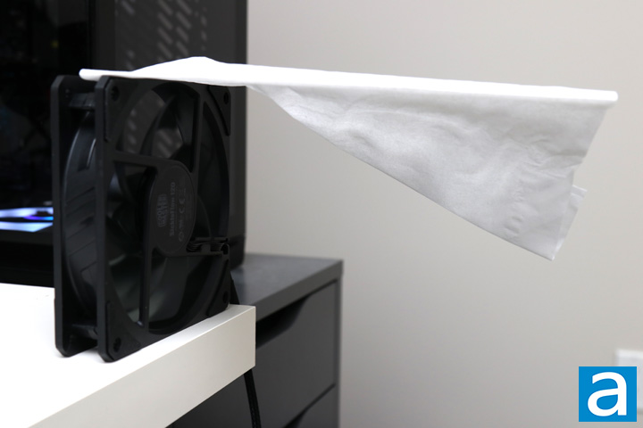 As you can tell from the above photos, the tissue paper flies in a very similar fashion between the all of the models. In the area closest to the fan, the tissue paper shows very little movement and this area stays up easily. Both sides are raised evenly here. Moving further away from the fan, you can see one side of the tissue paper slants off more than the other. Based on the shape of the blades and the specifications, the tissue paper flies with expected characteristics, which is to say we have a good amount of airflow and static pressure generated from these fans. As for consistency, the tissue paper stayed in place quite well with very little movement overall, which speaks to a steady airflow passing through the Cooler Master SickleFlow 120 fans.