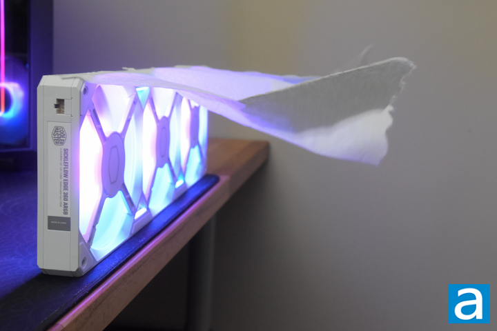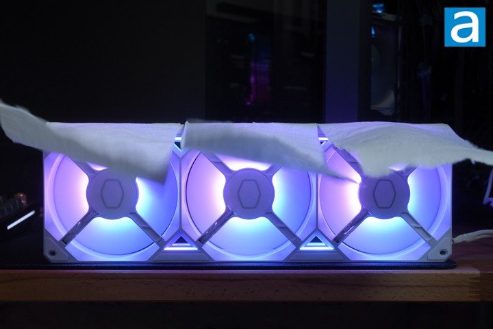 In the photos above, the fans are operated at their maximum speed. For all three fans in the unit, the paper was blown upwards at a consistent level, indicating even airflow and power. The first section of the tissue was blown steadily, almost parallel to the ground, with both sides of the tissue being level. The second section of the tissue paper started to flap with more movement as the airflow dissipates due to distance. This could have also happened because of the airflow from neighboring fans. From my observations, the Cooler Master SickleFlow Edge 360 ARGB fan produced strong airflow and static pressure.