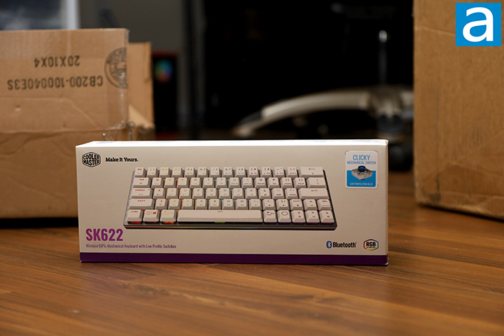 The retail box design for the Cooler Master SK622 is quite literally identical to the SK621, with the obvious exception of the name of the product. The white background is complemented by mainly black text for maximum contrast along with a burst of purple to help you remember who made it. Cooler Master's logo and slogan is at the top left corner, backlight-activated image of the keyboard is printed across the center, and the model name and product description are located at the bottom left corner. On the opposite corner, two icons indicate its Bluetooth connectivity and RGB backlighting. Our particular unit has low profile TTC RGB blue switches. Feature highlights can be found on the remaining sides of the box.