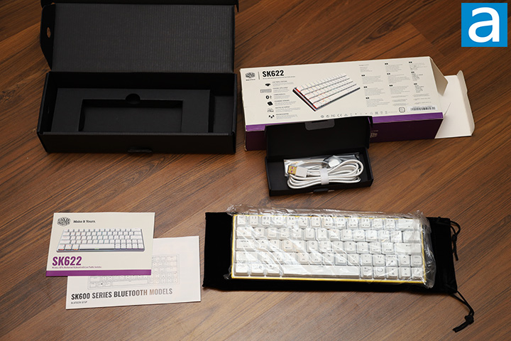 Out of the box, you will receive everything you need plus a few other things that are really nice to have. Securely placed inside the box is the Cooler Master SK622 keyboard itself contained in a classy suede drawstring bag, while the keycap puller and USB Type-C to USB Type-A cable is included inside a separate small box at the bottom. On the product literature side, you will find a Bluetooth setup guide as well as a quick start guide that shows you what some function key combinations do.