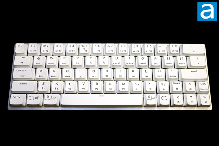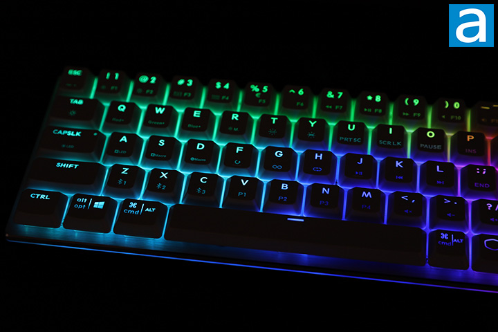 I am a big fan of fully backlit keyboards and I am happy Cooler Master designed the SK622 with this feature. The Cooler Master SK622's key illumination distribution is reasonably even for the most part, but there is a bit of backlight leak through the rear USB port. The area between the keys are also backlit thanks to the reflection of the LEDs, and I like it. One thing to point out, for keys with more than one line of text label, you will notice the top half is significantly brighter than the bottom half. This is due to physical design limitations of mechanical switch stems, as you can see in our photo above.