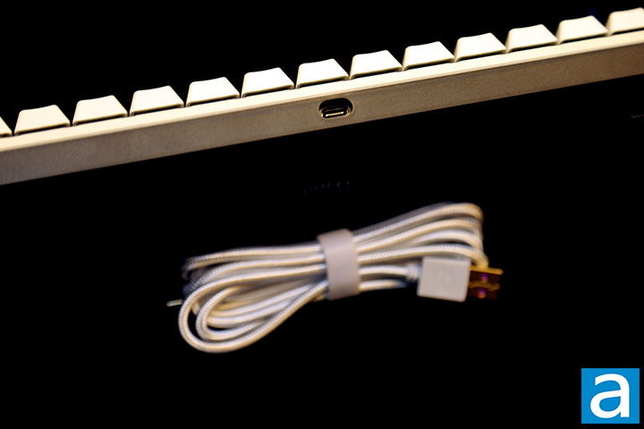 At the back of the Cooler Master SK622 is the USB Type-C cable lead out. It comes out in the center and is used for charging the keyboard's internal battery or using it as a wired keyboard if you desire. This braided cable is of average thickness and extends 1.8m in length to connect to your computer via one standard, gold-plated USB Type-A connector. When we bring about the question of whether gold plated connectors are actually useful or not, let us just say if it was the actual pins, then there is a possibility since gold offers better conductivity than other metals. This theoretically establishes a better connection with your computer, but on a digital signal level, we must understand it is a discrete one or zero; if anyone tells you they can tell the difference, you can definitely defeat their theory with a double blinded test. Additionally, if you are referring to the gold part of the connector you see on the plug, I would like to point out it is only used as ground. In other words, it is nice to have and it is pretty to look at, but it is not anything significant on a practical level. The gold-plated USB connector will not have any performance impact on the Cooler Master SK622, not to mention the SK622 is a Bluetooth keyboard and is designed to be used wirelessly.