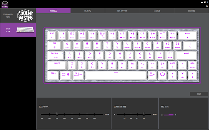 The main configuration window is separated into five tabs, as shown in our screenshot above. The first tab, wireless, allows you to configure settings like timeout and LED brightness. The second tab, Lighting, allows you to select RGB lighting effects and colors. Key Map shows a picture of the keyboard, where you can select individual keys and change their functions. The Macro tab allows you to program macros. Profiles is where you can import and export the four profiles stored on the keyboard's internal memory. Overall, I found Cooler Master MasterPlus+ to be basic, but it is very straightforward and easy to use. It is certainly not as powerful as Corsair's iCUE or SteelSeries' Engine. In fact, you can do most of the things directly on the keyboard without software, but my overall experience was positive.
