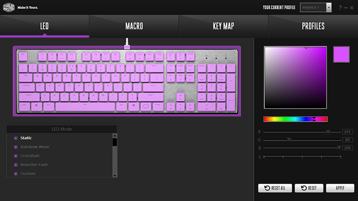 The main configuration window is separated into four tabs, as shown in our screenshot above. The first tab, LED, allows you to select RGB lighting effects and colors. The Macro tab allows you to program macros. Key Map shows a picture of the keyboard, where you can select individual keys and change their functions. Profiles is where you can import and export the four profiles stored on the keyboard's internal memory. Overall, I found Cooler Master Portal to be basic, but it is very straightforward and easy to use. It is certainly not as powerful as Corsair's iCUE or SteelSeries' Engine. In fact, you can do most of the things directly on the keyboard without software, but my overall experience was positive.