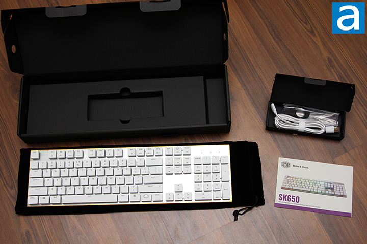Out of the box, you will receive everything you need plus a few other things that are really nice to have. Securely placed inside the box is the Cooler Master SK650 White Limited Edition keyboard itself contained in a classy suede drawstring bag, while the keycap puller and USB Type-C to USB Type-A cable is included inside a separate small box at the bottom. On the product literature side, you will find a quick start guide that shows you what some function key combination do.