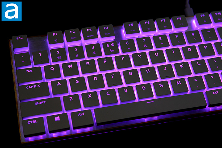 Hitting the Function key along with the labeled F1 through F8 buttons and arrow keys allow you to do things like cycling through different lighting effects or adjusting the effect speed. One strange omission is the backlight intensity cannot be adjusted on the fly directly. The closest thing you can do is to reduce the intensity of each RGB channel, but this is not an intuitive method. Fn in combination with F10 to Pause are for macros. The productivity keys double as your multimedia keys with Fn held down. You can even switch profiles, stored on the keyboard's 512KB internal memory, by going through Fn in concert with 1 to 4. Fn in combination with F9 toggles Win Lock on or off. Win Lock is an important feature in any gaming keyboard, because let us face it: How many times have you tried to duck in your favorite FPS while engaging an enemy, only to be killed instantly, because you missed the "Ctrl" key and your game was minimized? Hit the same key combination again and you can even lock the whole keyboard.