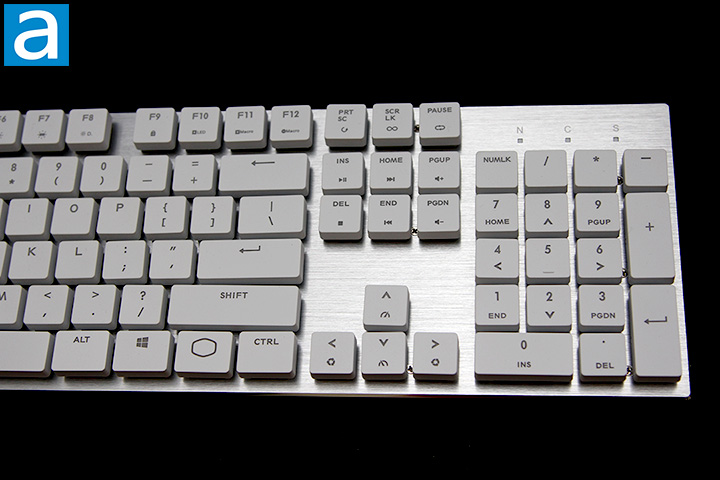The Cooler Master SK650 White Limited Edition, like the rest of the SK-series, is a very minimalist keyboard even though it comes with a keypad. As its name suggests, this is a special version in white, but you can buy the regular model that features black keycaps and a gunmetal colored backplate. It is one of the cleanest looking keyboards I have seen in a long time; very classical Apple. With straight edges, no dedicated macro keys, and a reference layout, you will have to look pretty closely, and in a sense, figuratively, to see what makes the SK650 special. Indeed, there is nothing that really sets it apart other than the fact this is a good old mechanical keyboard with real Cherry MX Low Profile switches. There is no integrated wrist rest and there is no specially designed OEM accessory for it. Meanwhile, the exposed silver colored brushed aluminum backplate is great to look at. It even hides fingerprints well. The sides and bottom are all made out of quality black plastic. Overall, I am a big fan of the looks, but aluminum backplate flexes slightly under heavy load. It would be nice if it was stronger, but it is not a major concern.
