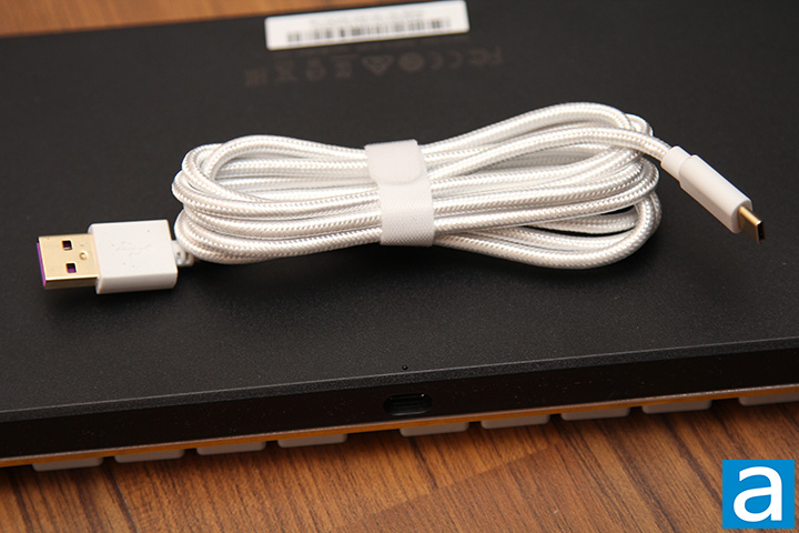 At the back of the Cooler Master SK650 White Limited Edition is the USB Type-C cable lead out. It comes out in the center and is detachable. This braided cable is of average thickness and extends 1.8m in length to connect to your computer via one standard, non-gold-plated USB Type-A connector. When we bring about the question of whether gold plated connectors are actually useful or not, let us just say if it was the actual pins, then possibly -- since gold offers better conductivity than other metals. This theoretically establishes a better connection with your computer, but on a digital signal level, we must understand it is a discrete one or zero; if anyone tells you they can tell the difference, you can definitely defeat their theory with a double blinded test. Additionally, if you are referring to the gold part of the connector you see on the plug, I would like to point out it actually does not make any physical contact electrically with your computer. In other words, it is nice to have and it is pretty to look at, but it is not anything significant on a practical level. The lack of a gold-plated USB connector will not have any performance impact on the Cooler Master SK650 White Limited Edition.
