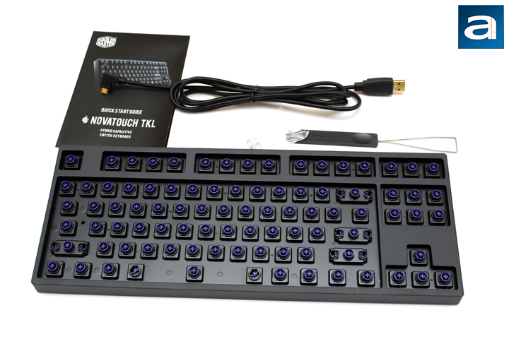 Out of the box, Cooler Master includes the NovaTouch TKL keyboard, braided micro USB to USB 2.0 cable, wire key puller, circular spring for the space bar, and a small quick start guide. I have to say it is quite weird not seeing any keycaps on the keyboard already, especially since I just would expect to be able to start typing with any keyboard out of the box. The keyboard arrived in a white foam bag to protect it from any scratches occurring during transportation. The quick start guide also has warranty information, as Cooler Master provides a two year warranty with all of their keyboards. Unfortunately, once again there is no wrist rest included here. Otherwise, there is not much else to talk about, so let us divert our attention to the keyboard at hand.