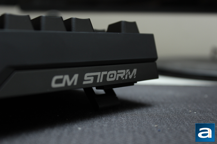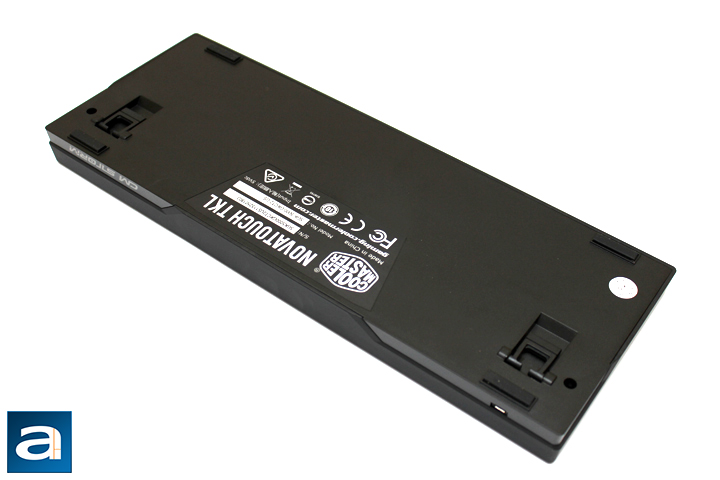 Flipping the keyboard to its underside, there are a few other things to note. On the bottom of the NovaTouch TKL are four rubber rectangular pads; one on each corner. At the back end, there are two extending feet, which are also rubber wrapped to ensure grip to the table. With the rubber and the weight of the keyboard, the NovaTouch TKL should not slide around too much, whether it is elevated or not. The back of the keyboard also reveals the micro USB port, where the removable cable connects to. As mentioned prior, the Cooler Master Storm NovaTouch TKL comes with a braided cable, measuring around 1.8m in length. The micro USB end is an L-shaped rather than a straight connection. I would have liked to see a similar solution for the NovaTouch TKL as we saw on the Quick Fire XTi, with routing tunnels for the cable, but this omission is not too big of a deal. Finally, the back is also the only place where Cooler Master puts any sort of logo, with a discrete "CM Storm" pasted there. Even so, this is quite hidden, and will not be seen on a day-to-day use.