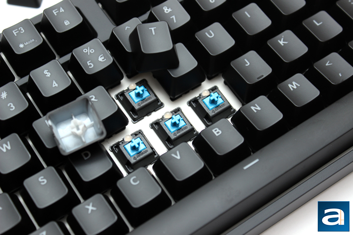 Our unit of the Cooler Master Storm Quick Fire XTi features Cherry MX Blue mechanical switches. Other switches are available for this model, including Cherry MX Red and Brown. These keys are rated to last up to fifty million keystrokes, just like other Cherry MX switches. Blue switches are what I would call a switch aimed at typists. These switches feature low resistance to typing, low actuation force of around 50g to trigger them, and an audible ‘click’ on every key press. They feature a non-linear travel, with a tactile bump in the middle to tell you when the key has been actuated. Gamers can still use Cherry MX Blue switches, but the real issue comes with double tapping, since it requires a bit more force and travel distance for a double tap to be registered. Preference of which keys will come down to consumer opinion.