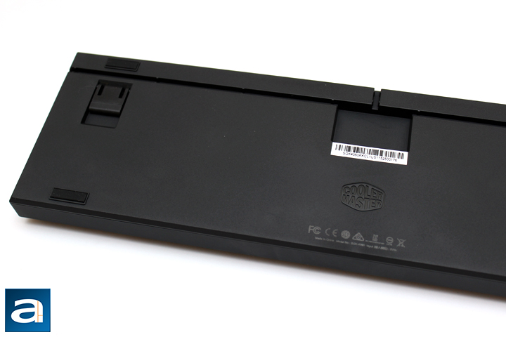 Flipping the keyboard to its underside, you have a few nice things to note. On the bottom is four rectangular rubber pads, one in each corner. At the back end on each side are two extending feet, which are also rubber wrapped to ensure grip to the table. Therefore, the rubber and the weight combined should keep the Cooler Master Storm Quick Fire XTi in place, whether it is elevated or not. In the middle of the back, there is a micro USB port, where the removable cable connects to. I should mention majority of mechanical keyboards use mini USB as their connection, so some users may find themselves forced to use a new cable. Since Cooler Master includes it anyways, switching out the old for the new is not a big deal. The real nice feature to point out here are the routing lanes for the wire. Cooler Master has integrated three different routes at the bottom of the keyboard, which allows you to wire your cables out either sides of the keyboard or out the back. Some of you might say this is no big deal, but I think this allows for all kinds of wiring, and giving users flexibility in their wiring is appreciated. Otherwise, there are is no audio passthrough or an additional USB port. I know I have never actually plugged something into my keyboard when it has a port, but it still would be nice to see.