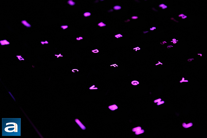 As for illumination options, Cooler Master has taken a different route in some ways. As you will have noticed in my overlook of the keys, you will know Fn + F1 and F2 adjust the colors of the backlight. This is because the backlighting is not customizable to the 16.8M colors of the rainbow, but rather thirty five shades of gray mixes between blue and red. When adjusting the colors, you adjust the color intensity of blue or red, and the mixture is shown on the keys. For example, mixing same intensities of blue and red produce Editor-in-Chief's favorite color, pink. Lighting quality is decent, but keys with two rows of engraved lettering, such as the Function row, produces uneven lighting. This happens because the LED only shines through the top part of the key, and not the bottom half. My only request for Cooler Master would be to make this keyboard an RGB keyboard. I know it does add more in cost, but a lot of keyboards nowadays use it as a great marketing feature. Red and blue might be the most popular colors for backlights, but just having the extra option would be nice.