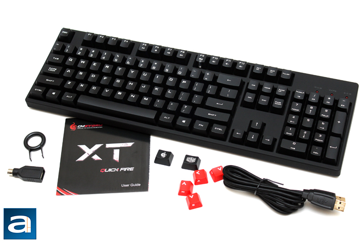 Inside the retail box is the Cooler Master Storm QuickFire XT, wrapped in a foam bag. There are also two areas hidden underneath cardboard flaps that house the extra keys, a key remover, braided USB cable, and a USB to PS/2 adapter. These extra keys include replaceable WASD keys so they become red arrows, but more on this later. The user manual is also located in the box with features and specifications listed inside in addition to warranty information. Just so you know, the QuickFire XT comes with a two year warranty, which is pretty standard with Cooler Master's mechanical keyboards. Unfortunately, there is no wrist rest again here, which would have been nice to see.