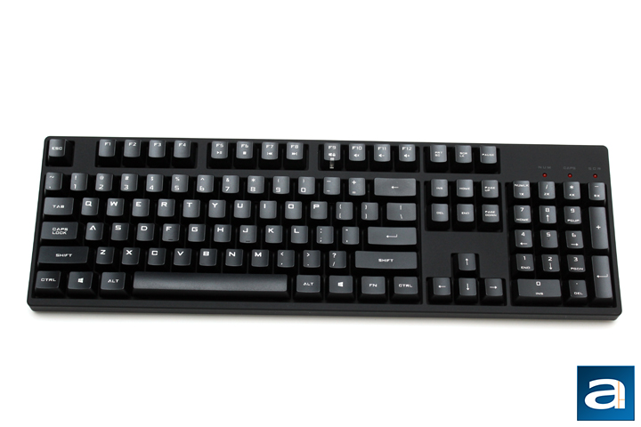 As for the layout, the Cooler Master Storm QuickFire XT came to us in a standard QWERTY ANSI 104-key layout. This should mean a few notable differences including the elongated, but single-row, Enter key, and an approximately fifty percent larger backslash key. Otherwise, most of the keyboard is laid out in the same way as every other keyboard sent to APH Networks. One Windows key is placed on either side near the Alt button, with an additional Function button on the right side of the keyboard. At the top right corner are three red LEDs for Caps, Num, and Scroll Lock, respectively. One thing I have noticed with the key caps themselves is how all the letters feel slightly raised. This is due to the etching of the keycaps, which are laser-etched. They should stand up to daily wear-and-tear, but your mileage may vary depending on your environment, usage, and so forth.