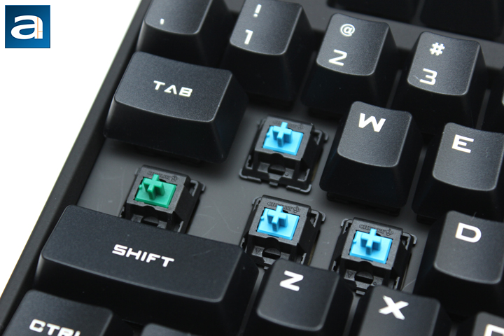 Our unit of the Cooler Master Storm QuickFire XT features two types of switches, Cherry MX Blue and Cherry MX Green mechanical switches. These keys are rated to last up to fifty million keystrokes, just like other Cherry MX switches. Blue and Green switches are what I would call switches aimed at typists. Blue switches feature low resistance to typing, low actuation force of around 50g to trigger them, and an audible ‘click’ on every key press. On the other hand, Green switches feature the same audible feedback, but with a higher actuation force of 80g to trigger. Both feature a non-linear travel, with a tactile bump in the middle to tell you when the key has been actuated. Gamers can still use Cherry MX Blue or Green switches, but the real issue comes with double tapping, since it requires a bit more force and travel distance for it to be registered. Preference of which keys will come down to consumer opinion.