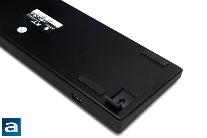 Flipping this keyboard onto its backside, the Cooler Master Storm QuickFire XT has the same underside as the original keyboard, which means we have the same four rectangular rubber pads to hold the keyboard in place. Two retractable feet are placed at the back to raise the keyboard if the user deems necessary. However, unlike the original, these two feet are wrapped with rubber, which should improve the grip between the keyboard and the surface it is placed on. With these two features in mind, users should not worry about the keyboard shifting unintentionally. At the back of the QuickFire XT is a full-sized USB input, where the included cable connects from the keyboard to the computer. The fully-braided USB cable measures at 1.8m in length.