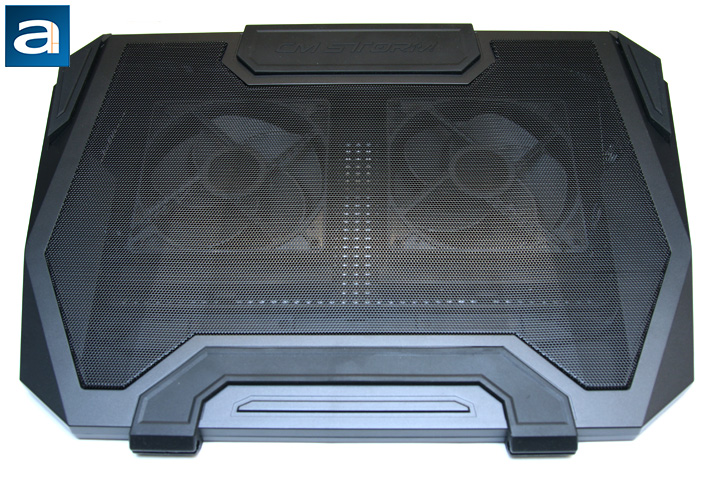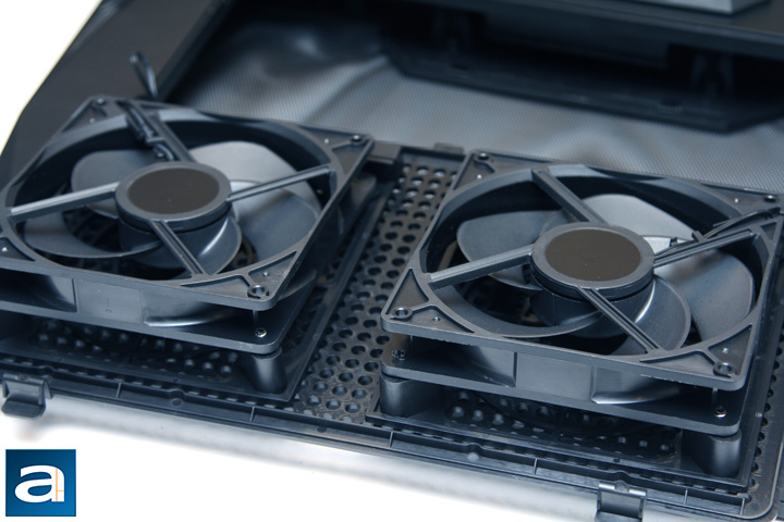 Have you ever thought about having a laptop cooler that may look cooler than your laptop itself? Or just put in this way: Do you want to get a fancy laptop cooler, which is almost as big as your gaming laptop, to catch eyes at a LAN party? The SF-19 V2 could be the answer. From the top view, it is completely black, which is a symbol of bad, and I mean it in good way. The majority of its top is covered with a cold-forged polygon mesh surface. It is cold-forged, since the material is not that hard that requires hot-forging. The mesh surface allows cold air to be blown through for cooling purposes. The mesh surface is not purely flat, in fact, it has several creases. This design is not just purely for aesthetic considerations. More importantly, it reinforces the structure so the mesh surface can support the weight of a 19" laptop. Underneath the mesh surface, two 135mm fans are situated inside the chassis. Well, comparing to its predecessor, the diameter of the fan was slightly reduced. Although we cannot say that this is a degradation, since the performance of the fan does not solely depend on the size. The new fan features sickle shaped blades; for this part I will get into details shortly. There are four pieces of rubber bumpers attached around the edges and corners of the SF-19 V2. The layout and the functions of the rubbers remain the same as its predecessor. They are to provide friction to your laptop, act as a handle, supply a cable slot, and to serve as bumpers.