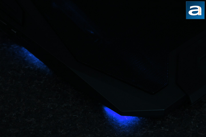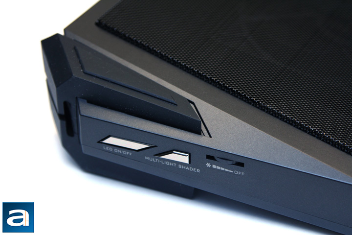 The above picture shows the details of the front left corner of the Cooler Master Storm SF-19 V2. Here we have the anti-slip rubber cable slot, LED on-off switch, LED multi-light shader, and the fan RPM controller. The picture clearly reveals the design of the cable slot. It is grooved upward and downward behind the slot. The shape of the cable slot can also be used to clip the wires that go through it, such that the user will not get a mess of wires around the cooler. Two of the silver switches are located on the left side of the cooler right beside the rubber cable slot. One of them is dedicated to turn on and off the LED lights, and the other one is to change LED illumination modes. We will see how the LED lights work later. Near the LED switches, there is a fan RPM controller that can adjust the rotors' spinning speed. All the switches and buttons are nicely arranged at this corner, so they are convenient to use by one hand.