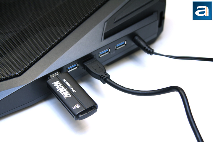 All the plug ins of the CM Storm SF-19 V2 are put at the right side of the cooler. There are four USB 3.0 slots ready for your laptop extensions. Those USB ports are connected to your computer through a Micro-B USB connector. The power input indicates that the input voltage is 5V. Note the previous version of the cooler has a 30W adapter, while this product uses a 20W adapter. Either should be more than enough for something of this purpose.
