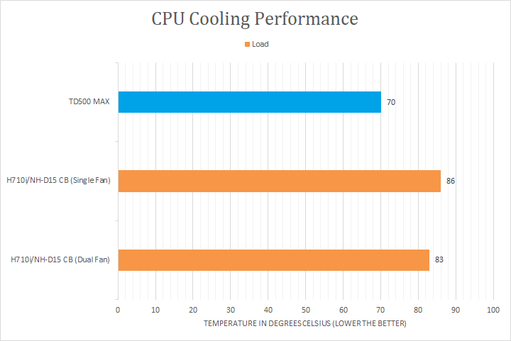 In the load test, the test processor, my Intel Core i7-12700K, generates quite a bit of heat that will give most coolers a run for their money. The TD500 MAX came in a whopping 13c lower than the top-performing NZXT H710i/NH-D15 chromax.black in dual fan configuration, and an even better 16c delta against the single fan configuration. This result is very good, considering the TD500 MAX was benchmarked against a pretty formidable foe.