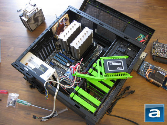 The Cooler Master 690 II Advanced NVIDIA Edition is quite a roomy ATX chassis to work with, so it really does not matter if you install the power supply or motherboard first. Out of personal preference, I got my NZXT HALE90 750W to get the wires worked out first. Everything is quite simple; due to the abundance of openings in the motherboard tray, everything leading out of the power supply unit can be sent behind the motherboard tray. Cable guides can be used with zip ties to secure things in this area. Meanwhile, I also pre-routed the front panel I/O, audio, SATA, and USB cables to ensure everything is neat and tidy before the motherboard comes onto the scene. The front panel connectors actually don't require much work; but if you don't do it correctly you can see them behind the hard drive trays if you look carefully. Better cable routing in this area would be highly appreciated. On a side note, the special tray for accommodating 2.5" drives is not tool free, so you will need to attach four screws from the side yourself.