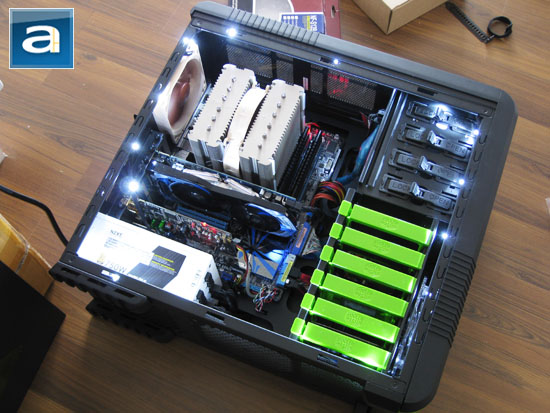 Judging by the fact that the Cooler Master 690 II Advanced NVIDIA Edition made it to my main computer desk, it should be quite clear it is a pretty decent case in yours truly's opinion. This chassis is one of those rare breeds in the modern enthusiast market that actually meets my requirements! Why is so hard to find a clean looking ATX mid-tower and a clear side window with no fan openings nowadays? Yes, I had to make a few modifications to the 690 II Advanced in sealing off a couple vents I don't need, but at least the top opening is situated between a removable top panel to make this achievable without negatively affecting the aesthetics of this case. I understand the top opening improves airflow, but I can live without it -- most of you may beg to differ, and I actually appreciate this flexibility. All in all, there is quite a bit to like about the Cooler Master 690 II Advanced NVIDIA Edition. On the outside, highlights include a sleek exterior look, unique side panel window, and a convenient Serial ATA hot swap bay at the top. On the inside, we have a beautiful black painted interior with excellent cabling slots to make installation an absolute pleasure. That's not to mention tool-free installation that works surprisingly well. For less than $100 at press time, a larger side window revealing more of your computer's interior, quieter fans along with better dust filters would be my top picks. And if you don't like all the green, Cooler Master also sells a non-NVIDIA branded Cooler Master 690 II Advanced for a less polarizing look -- a large clear side panel can be purchased separately; but it comes with a vent for a 120mm fan on the window.