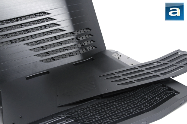 One prominent and highly anticipated feature to the Cooler Master Cosmos II are the two side panels. From above pictures, it is already fairly clear as to how the doors swivel, and how functionally benefiting it can be. Standing alone, however, we can get a closer look at the materials used in the panels, thickness, appearance, weight, and most importantly, functionality. First off, since the case is very large, the panels themselves are also very big. The thickness at its thickest section reaches to almost 2.5cm, which is unheard of in a case. The weight, however, is surprisingly lightweight, considering the size and thickness. This is because the majority of the materials used is plastic, with thin metal strips and braces used for the hinges, and brushed aluminum plating on the outside. Featured on both side panels are the air filters for the optional side GPU and HDD fans. Both side panels differ from each other, one with an additional filtered and meshed area for the GPU fan placements. The air filters are fastened onto a large piece of plastic that can be removed from the entire side panel by removing the screws. Lastly, using the above image as a reference, the rectangular cutouts on the inside of the side panel are used as handles in carrying the side panel, and removing it from the hinges on the case.