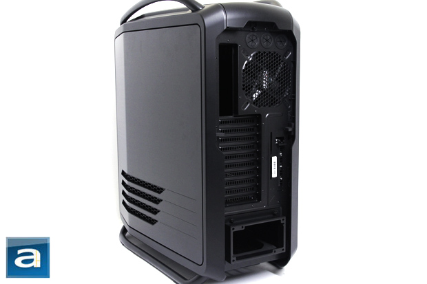 At the back of the Cooler Master Cosmos II, we can see that the overall layout is quite conventional. The unit utilizes a bottom mounted power supply unit, but mounting the PSU slightly differs from other chassis. The PSU is mounted by removing the bracket via unscrewing four thumbscrews and using the provided screws to screw the bracket directly onto your device. The PSU can then be mounted back onto the case using the previously removed thumbscrews. Above the PSU bracket is a total of ten expansion slots, which will fit almost any setup. These expansion slots allow air to flow through them, which is nice. Above the expansion slots, one will find the I/O shield opening. To the right of that is a circular stamped fan vent for the 140mm exhaust fan. It will spin up to 1200 RPM, and should be way more than sufficient in handling heat exhaust. Just above the fan is an array of three pre-drilled and pre-fitted water cooling holes for those who want to use external water cooling radiators. Lastly, two switches on the sides of the back are used to effortlessly open the side panels, which is a great addition to have.