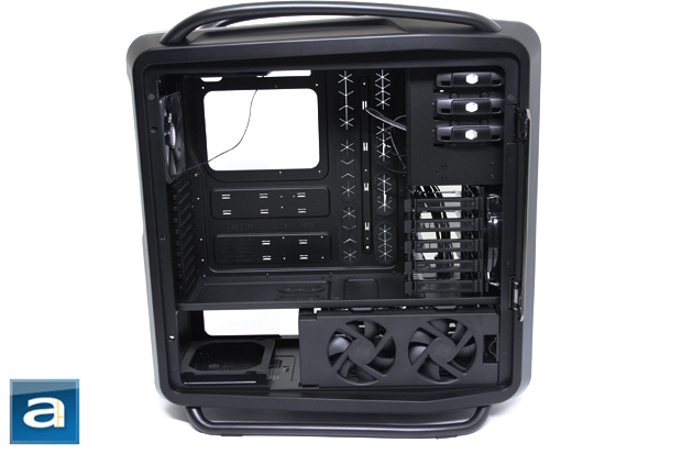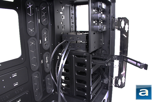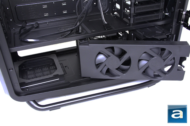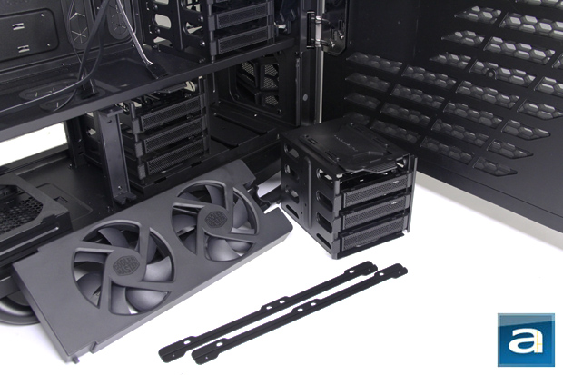 Taking a look at the above image, you can get a close idea as to how the bottom section further operates. Behind the two provided 120mm fans and fan bracket are two additional HDD frames that allow an additional six HDDs to be utilized. As aforementioned, one of the main features is adding radiator support in this area by removing the two HDD frames, and installing the provided radiator brackets.