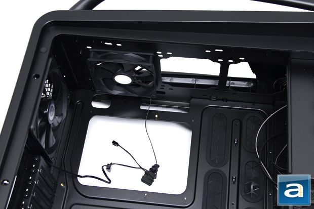 The Cosmos II is an "ultra tower" -- from a marketing perspective -- that can house pretty much any size of motherboard. The motherboard form factors supported include mATX, ATX, eATX, XL-ATX, SSI CEB, and SSI EEB. The standoff mounting holes are clearly labeled on the motherboard tray; in fact, some standoffs are already pre-installed for you from the factory. The enclosure uses a 140mm 1200RPM exhaust fan rated at 19dBA. with a smaller 120mm top fan also rated at 1200RPM at 17dBA in the area above. The case allows an additional two 120mm fans to be mounted at the top. Just to note for your reference, there is sufficient room between the fan mounting bracket and the top bezel to fit thick radiators for internal water cooling solutions.