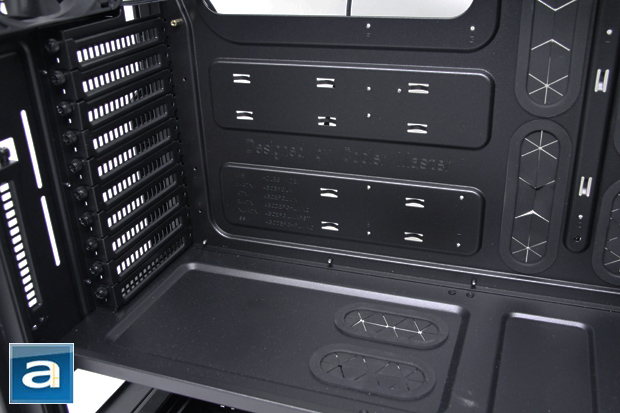 One of the benefits of having such a large chassis are the internal build features and luxuries that manufacturers can focus on. In the case of the Cosmos II, the internal layout of the enclosure includes two separate chambers with entirely different airflow patterns. The above photo is a quick snapshot of the bottom area found at the top section of the case; where the bottom steel floor separates the two chambers. Here, you will find a total of ten expansion slots with removable thumbscrews. The bottom includes two rubber cable hiders for one to route fan cables and water hosing if you have a bottom radiator. Also, one may find it useful to route front panel input/output cables here for a cleaner internal setup.