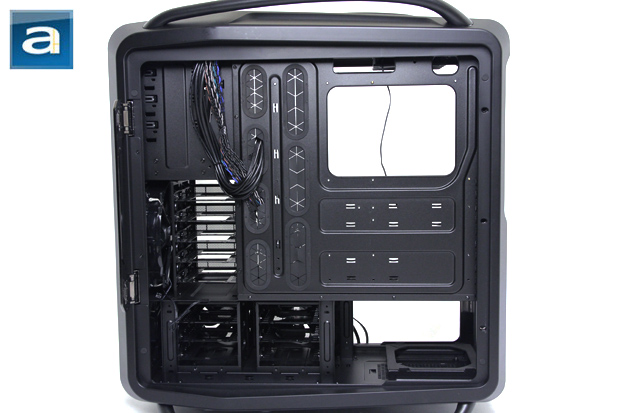 By removing the two side panels, one can open up the case for internal viewing. As aforementioned, the swivel doors can be unlocked from the two switches at the back of the case, and then the entire side panel can be lifted off of the hinges using the interior handles. The entire process takes less than five seconds, which is awesome. In contrast, the interior of this full-tower chassis is much more complex when compared to the refined and luxurious outside. Painted matte black all around and fitted with rubber cable flap hiders, the overall quality is great. Much like the exterior, the Cosmos II follows the same black color scheme.