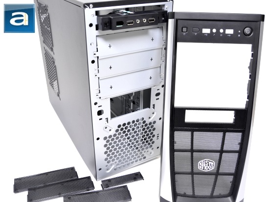 As far as the physical look is concerned, Cooler Master has done a relatively bang-up job on the Elite 371 for a budget case. For some reason, I got an 'Australian' unit signified by the upside-down logo, but I am sure retail units would not have this problem -- Cooler Master assures us this is an isolated incident. It is definitely not overdone like many chassis I have seen, and yet still maintains a distinct look from your average run-of-the-mill chassis. Since aesthetics are a very opinionated topic, I will leave you to decide whether or not it deserves your approval. The body of the Elite 371 consists mainly of steel sheet metal that is pieced together relatively well. The front bezel, however, is made mainly of acrylonitrile butadiene styrene (ABS) plastic that is known for its lightweight and relatively durable properties. Also seen on the bezel would be a steel mesh material for the front bay covers. I will go into more detail later.