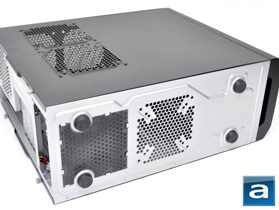 Once the front panel is removed, we can see the external drive bay options on the Elite 371. There are a total of three 5.25" bays that can be used, which is more than enough for most users. Below the 5.25" drive bays is a single external 3.5" bay. This can be used for those who still utilize floppy bays or other external 3.5" components. To utilize an external 5.25" bay, however, one will need to manually clip off the small piece of sheet metal, which is not replaceable. At the bottom of the front is another cooling option that can be used. According to my measurements, as well as the information provided in the specifications, the front can utilize one 120mm or one 140mm fan; not included. This can provide cooling for the internal hard drives.