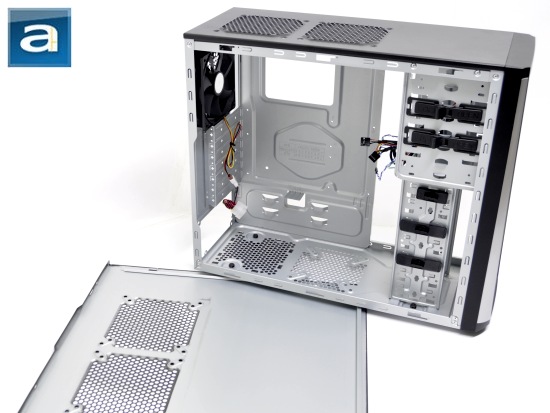 By removing the four thumb screws, we can take off the two side panels to gain access to the interior of the Cooler Master Elite 371. The first thing that pops out would be the paint job, or lack thereof. Cooler Master has decided to leave the steel metal color untouched by paint to save on the extra cost and effort. It would be more preferable in my opinion to have the interior of a nice paint finish, but it is not a something to fret about, considering the cost of this case. Below is an inside view of the side panel. As stated before, the side panel consists of two fan mounting options for more air cooling freedom, but unfortunately, it lacks air filters.