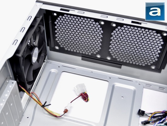 Since the Cooler Master Elite 371 is a mid-tower chassis, it is able to house ATX and mATX sized motherboards. The motherboard tray on the Elite 371 is clearly labeled by letters corresponding to its manual that provides further information. Like most cases, the Elite 371 has a 120mm pre-installed exhaust fan installed at the back. What is particularly thoughtful of Cooler Master is that they have included a 3-pin to Molex adapter to allow more flexibility when playing around with the wiring. However, the small downside is that this wire is extremely short, and some may be forced to use the Molex adapter to increase its length. At the top are an additional two optional exhaust fan cooling options that can be used. It seems Cooler Master is very generous when designing this case to allow so many additional cooling options to the case. Ironically, however, the case only comes with one pre-installed fan. The two roof fan mounts come with a large air filter that can be removed and cleaned. This will prevent dust from entering the roof if you decide to mount fans. Even if you decide not to mount fans here, the filters also act as dust blockers to prevent dust from simply settling in.