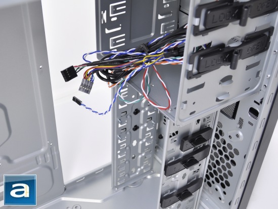The Cooler Master Elite 371 has a fairly open interior design. The motherboard tray may not be as open as other chassis that includes a top opening or rubber grommet-ed holes for wiring. However, since the Cooler Master Elite 371 is fairly small, there is simply no room. The Elite 371 gives us plenty of open room for wire management by the interior 3.5" HDD bays instead. We will go into this in more depth a little later.