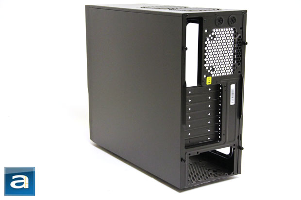 Looking to the left of the back side on the picture above is the back side panel. This side panel also does not feature any extra cooling options. Since the motherboard backplate needs no cooling, and a system has no reason to attract more dust, this side panel is as perfect as it gets as well; not to mention a clean appearance is much more attractive than a circular or hexagonal stamped fan mesh.