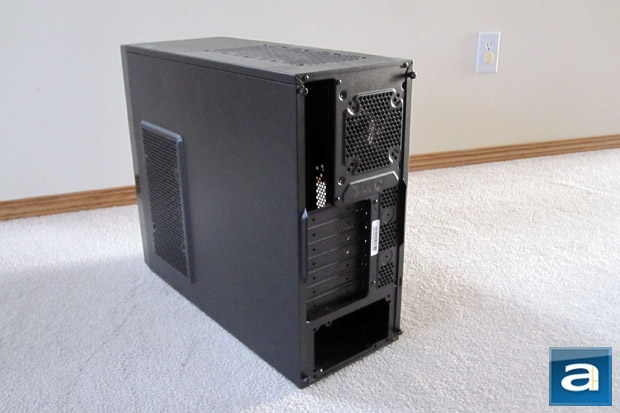 On the back side is a large 120mm exhaust fan opening at the top, again with the circular pattern. The motherboard opening is right beside the fan vent. Below are the expansion slots, seven in total, that allow for other components to be added to the motherboard. Beside that are two indents that can be drilled out for water cooling holes. Since this is a budget friendly case, it would be surprising to see these holes pre-drilled out, as most users in this range would be cooling their computers via air. I agree with their decision to leave it up to the user. Finally, located at the bottom is the power supply bay. Most of this is quite standard to any other case, and everything is there as it should be.