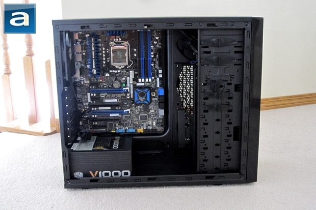 Following APH Networks standards, the first component to install is the power supply. I had no issues with this, as the bottom of the case is without other obstacles preinstalled into the case. I also have no worries in putting a larger power supply like the Cooler Master V1000 1000W, and thinking whether or not it would actually fit. The next step is placing the motherboard in. The motherboard I placed in the case is an ATX sized motherboard; namely the Intel Desktop Board DZ77GA-70K. Both the mATX and the ATX holes have labels corresponding to where the risers and screws are to be placed. At first, it was actually quite difficult to put in the risers, as they require a bit more twist than I can give using my fingers, and the riser itself has no place to wedge a screwdriver in. However, Cooler Master provides the user with a small tool that fit over the riser, and has a Phillips-head slot to put the screwdriver in on the other side. This makes installing the risers much faster and soon the motherboard was screwed in place.